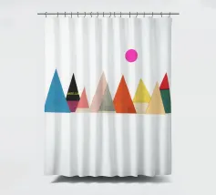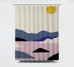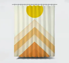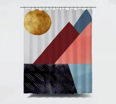 Le forme geometriche formano un paesaggio montano minimalista, con un cerchio in alto che ricorda il sole. Sotto è raffigurato un riflesso invertito delle cime, che crea un disegno simmetrico.