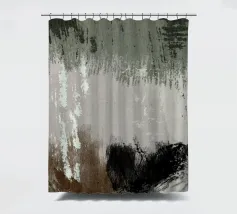 Opera d'arte moderna e astratta con giochi di forme e texture in toni di colore tenui come beige, giallo tenue, blu-grigio, marrone-rosso e con una linea di pennello nera. Le diverse forme organiche, le linee, le texture e le pennellate conferiscono un aspetto interessante che attira l'attenzione.