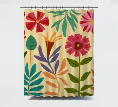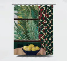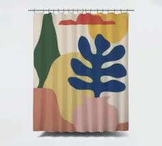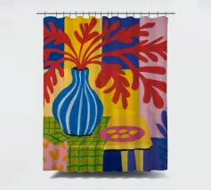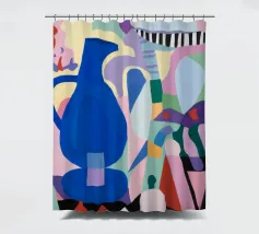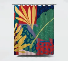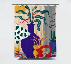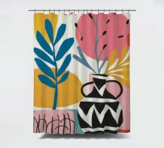 Una moderna natura morta astratta con una pianta stilizzata in un vaso blu, un croissant e forme organiche sotto un sole giallo, il tutto in una composizione equilibrata e calda.