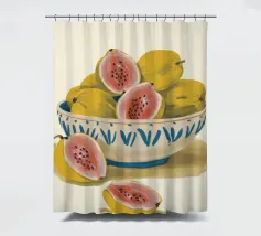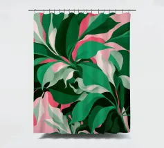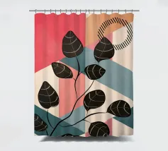 Forme botaniche astratte, tra cui foglie e steli nei toni del rosa, del viola, del blu e del beige, sono disposte su uno sfondo scuro. La composizione è elegante e moderna, incentrata su forme organiche e giochi di colore.