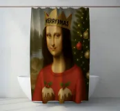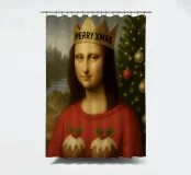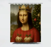 Monna Lisa indossa un buffo maglione natalizio e un cappello con corona di carta natalizia. Sul suo pullover natalizio ci sono due pudding natalizi e un albero di Natale alle sue spalle.