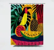 Questa composizione accattivante combina flora, fauna e frutta per creare una festa visiva. L'intensa tavolozza - turchese brillante, giallo radioso, rosa ricco e verde intenso - ricorda i sogni della giungla di Henri Rousseau. Il maestoso tucano siede in trono come un re sopra il suo regno tropicale tra foglie di monstera, ananas e meloni. La riduzione grafica e i contorni decisi mostrano influenze della moderna cartellonistica. Ogni elemento pulsa di energia e gioia di vivere. Un'opera che risveglia immediatamente la voglia di viaggiare e trasforma qualsiasi stanza in un rifugio tropicale.