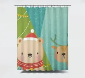 Allegra illustrazione con un orso e un cervo che indossano abiti natalizi accanto a un albero di Natale, irradiando allegria e felicità nel giorno di Natale.