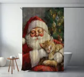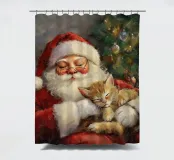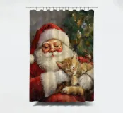 Un'immagine natalizia che scalda il cuore e che infonde sicurezza: Babbo Natale siede rilassato davanti all'albero decorato a festa e tiene in braccio un gattino che dorme pacificamente. I colori tenui e la luce calda conferiscono alla scena una calma magica, simbolo dell'amore, della pace e della tranquilla gioia del periodo natalizio.