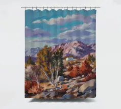 Un pittoresco paesaggio autunnale che raffigura un villaggio o una fattoria adagiata su una collina, circondata da un mosaico di alberi colorati nei toni dell'arancione e del giallo e da campi coltivati, con le lontane montagne blu a completare la scena.