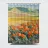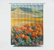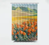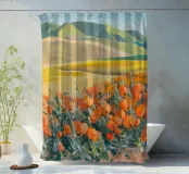 Un campo di papaveri arancioni crea un brillante patchwork di colori su dolci colline verdi e dorate, rese in modo stilizzato e moderno che enfatizza la gioia del paesaggio.