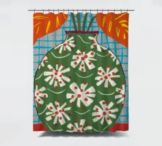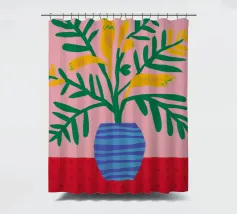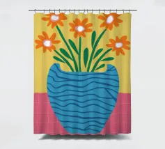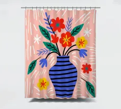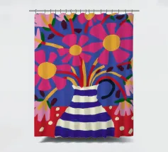 Un vaso a righe bianche e blu contiene fiori gialli e rosa, su uno sfondo vibrante, simile a una trapunta, con motivi floreali rosa, arancioni e rossi.