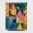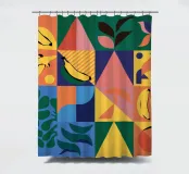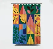 Un audace e dinamico patchwork di forme geometriche, con banane stilizzate e foglie tropicali. La palette di colori vivaci e il forte stile grafico creano una composizione giocosa ed energica.