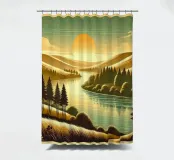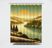 Poster di viaggio vintage di un fiume tranquillo all'alba con acqua dorata, nebbia mattutina, rive alberate, punte di canne lungo la riva e colline lontane in una luce soffusa. Forme geometriche pulite, una sottile texture della carta e una tavolozza di paglia, muschio e ardesia creano una stampa naturalistica senza tempo ideale per soggiorni, camere da letto, studi e arredi moderni.