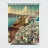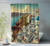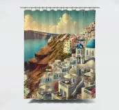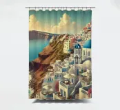 Poster di viaggio vintage di Santorini, Grecia, con case bianche sulla scogliera, cupole blu, strette scale e terrazze, una tranquilla baia dell'Egeo all'interno della caldera, piccole imbarcazioni sottostanti e una tenue foschia al tramonto. Le forme geometriche pulite, la sottile texture della carta e la tavolozza luminosa delle isole creano una stampa mediterranea senza tempo, ideale per soggiorni, camere da letto, arredamento costiero e spazi per le vacanze.