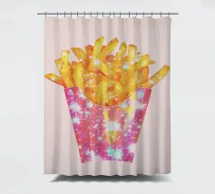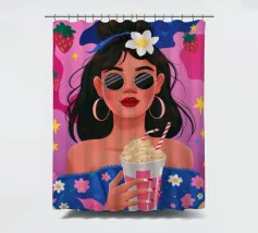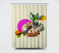 Un collage giocoso e retrò che fonde l'estetica vintage con la cultura pop: una ragazza degli anni '60 in bianco e nero con occhiali tondi e sciarpa si trova di fronte a un cactus mediterraneo, un cono gigante di patatine fritte, una Vespa nera e una ciambella rosa con zuccherini colorati. La composizione è arricchita da audaci cerchi di colore in stile grafico. Perfetta per gli spazi creativi, le cucine moderne o gli interni degli amanti della pop art.