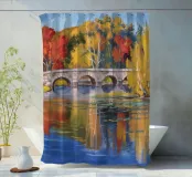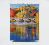 Un ponte di pietra attraversa un fiume ampio e calmo che riflette perfettamente i brillanti colori autunnali degli alberi sulle sue rive: rosso fuoco, arancione e giallo sotto un cielo azzurro tenue.