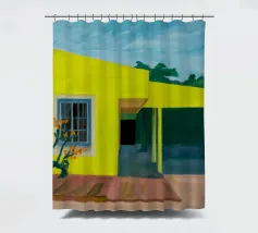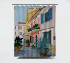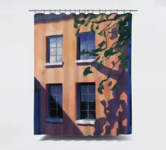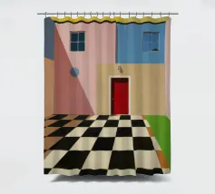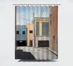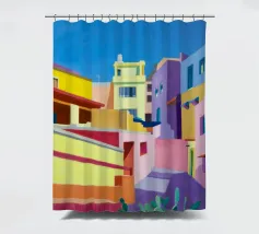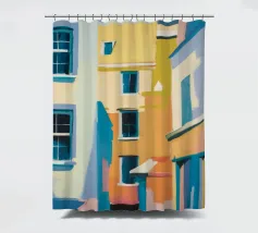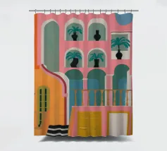Una complessa scena urbana è resa con un'attenzione particolare alle forme geometriche e a un'audace tavolozza di colori rosa, verde acqua e rosso. Una scala esterna fornisce un forte elemento compositivo, guidando l'occhio attraverso le forme architettoniche astratte.