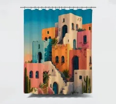 Quest'opera d'arte cattura la bellezza iconica di un'isola greca con i suoi gradini vivaci e colorati nei toni del rosa, dell'arancione e del rosso. La classica architettura bianca e blu incornicia la scena, creando un'immagine gioiosa e pittoresca che trasporta immediatamente in un vicolo soleggiato di Santorini.