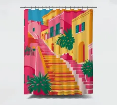 Una vivace scena di strada con edifici colorati e una scalinata rosa acceso che sale verso l'alto, evocando una vivace città costiera mediterranea o italiana.