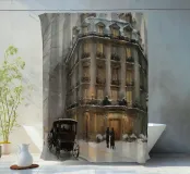 Un romantico paesaggio urbano dal sapore invernale: una carrozza nera trainata da cavalli si ferma nella neve fresca davanti a un magnifico edificio antico con finestre illuminate in modo caldo. Due persone elegantemente vestite sono impegnate in una conversazione, mentre i lampioni gettano una luce dorata sulla strada innevata. La scena racconta di un'epoca passata, dell'eleganza e della tranquilla bellezza di una serata innevata in città.