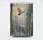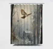 In una tranquilla foresta innevata, un gufo plana silenzioso su una capanna solitaria. I colori tenui e la luce soffusa conferiscono alla scena un'atmosfera misteriosa e pacifica. Questo suggestivo dipinto invernale cattura la bellezza della natura e la magia della solitudine invernale, simbolo di tranquillità e contemplazione.
