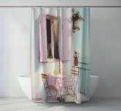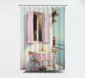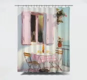 Il motivo raffigura un'affascinante scena di balcone mediterraneo in tenui colori pastello. Un tavolino con una tovaglia rosa, due sedie e una bottiglia invitano a soffermarsi al sole. Le pennellate morbide e la luce calda trasmettono una sensazione di estate, leggerezza e vacanze al mare.