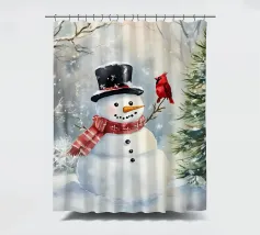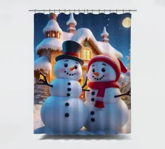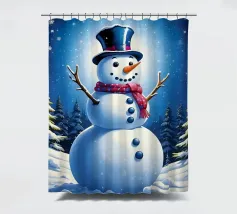 Un pupazzo di neve, con tanto di cappello a cilindro e sciarpa, saluta la sera d'inverno in una foresta serena. I fiocchi di neve cadono delicatamente intorno, creando un'atmosfera magica.