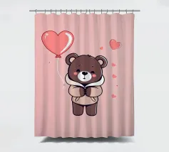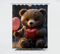Un simpatico orsacchiotto vestito con un'accogliente felpa con cappuccio siede nella neve, tenendo gioiosamente un cuore rosso mentre un palloncino si muove nell'aria fresca della sera sotto un tramonto colorato.