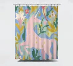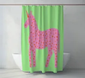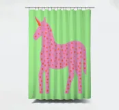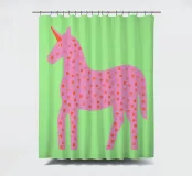 Questa giocosa illustrazione mostra un unicorno rosa con puntini su uno sfondo arancione e verde, perfetto per le camere dei bambini o per le decorazioni estive. La grafica dipinta a mano combina elementi fantasiosi con un design minimalista e crea un'atmosfera allegra che irradia gioia e creatività.