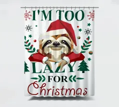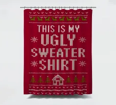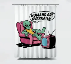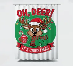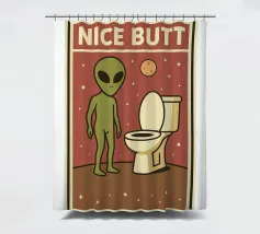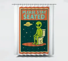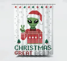 Un alieno con cappello da Babbo Natale e maglione natalizio è circondato da fiocchi di neve e alberi di Natale. Il disegno chiede ironicamente: "Perché il tappeto è tutto bagnato?" con colori festosi.