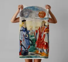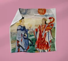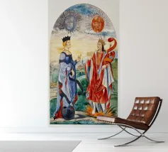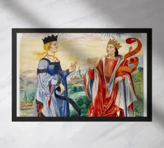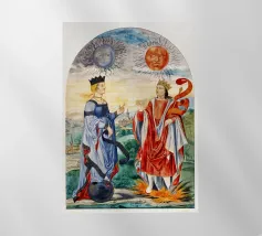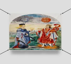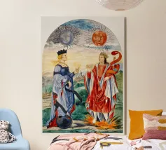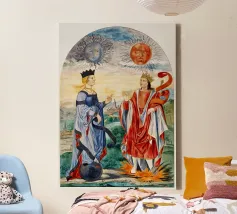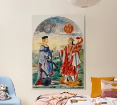 Questa straordinaria illustrazione allegorica del XIX secolo, proveniente dalla Wellcome Library, raffigura una regina regale incoronata dalla luna (vestita con fluenti abiti blu) e un re illuminato dal sole, a simboleggiare l'equilibrio tra potere cosmico e terrestre. Ricco di simbolismo esoterico, il pezzo fonde l'iconografia di ispirazione rinascimentale con le prime curiosità scientifiche: ideale per gli appassionati di tarocchi, per gli amanti della storia o per gli amanti dell'arredamento celeste vintage.