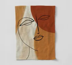 A continuous line drawing creates an abstract face with red lips and a star, overlapping with a sun shape on a textured background, blending minimalism and surrealism.