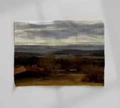 Un vasto paesaggio si estende in lontananza con dolci colline sotto un cielo per lo più nuvoloso, dove il sole irrompe, proiettando la luce sul terreno. La scena trasmette un senso di tranquillità e apertura, accentuato dai colori tenui del tardo pomeriggio o della prima serata.