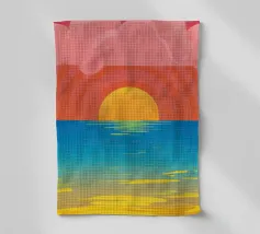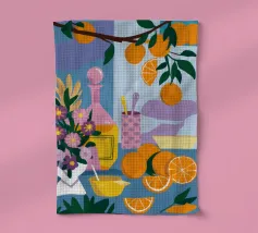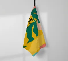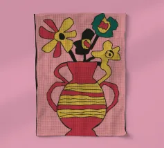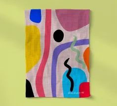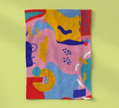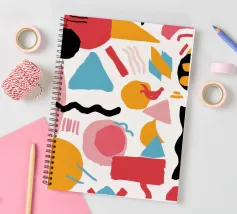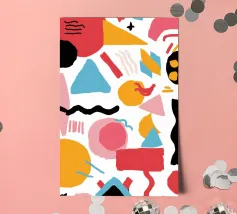 Una composizione astratta caotica e divertente in stile Memphis, con un assortimento casuale di forme geometriche, ghirigori e motivi. L'opera d'arte è energica, giocosa e ha una fresca atmosfera retrò.