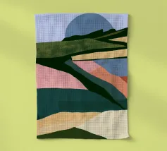 Una vista panoramica di campi ondulati e patchwork resi con colori pastello, creando un paesaggio da sogno.
