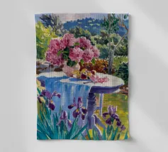 Un'audace natura morta con vivaci fiori rosso-rosa, forse papaveri o gerani, in un semplice vaso, accanto a fresche pere verdi, il tutto su una ricca tovaglia rossa che contrasta nettamente con uno sfondo blu intenso.