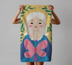 Il dipinto raffigura una persona con capelli corti e scuri acconciati a onde, che indossa un abito con motivi retrò e cerchi e diamanti nei toni del rosa, del marrone e del beige. Lo sfondo è di un semplice colore beige chiaro.