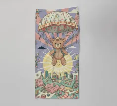 Una magica illustrazione verticale che cattura un momento stravagante, mentre un gruppo di coniglietti si prepara al lancio di un razzo alimentato da un palloncino. Ambientata su una piattaforma di legno sotto un cielo da sogno, la scena fonde ingegneria, fantasia e lavoro di squadra in toni pastello. Perfetto per la stanza di un bambino o di chiunque sogni l'esplorazione e l'avventura con un fascino morbido e pittorico.