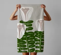 Un'affascinante opera d'arte astratta con rose e fogliame stilizzati di colore bianco sporco su uno sfondo verde salvia con un bordo neutro, perfetta per l'arredamento boho e moderno.