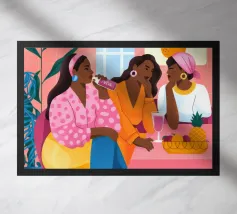 Questa opera d'arte ritrae una persona avvolta da piante verdi e rigogliose, che indossa un abito bianco con motivi arcobaleno. L'arco rosa sullo sfondo aggiunge un sereno tocco botanico.