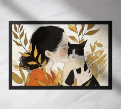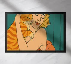 Una commovente illustrazione di una donna con una camicia a righe, con gli occhi chiusi, che abbraccia amorevolmente un grosso gatto rosso. Lo sfondo di piante in vaso contribuisce a creare un'atmosfera accogliente, da "genitore di piante e animali".