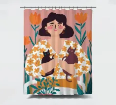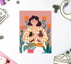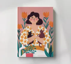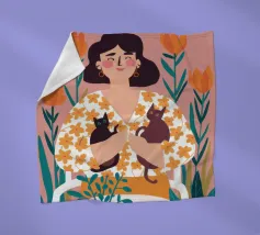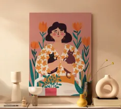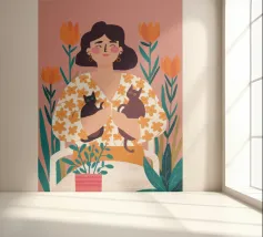 Una commovente illustrazione di una donna che abbraccia dolcemente un piccolo e soffice cane, circondata da una cornice di bellissimi fiori colorati.