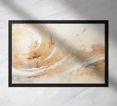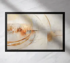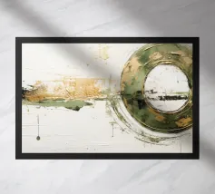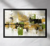 Quest'opera d'arte è una composizione astratta in formato panoramico, caratterizzata da un mix dinamico di texture, colori e forme geometriche. La texture è ricca, con pennellate visibili e strati di colore che creano un'atmosfera speciale. Il gioco di toni verdi e terrosi con accenti metallici conferisce all'opera un'energia armoniosa e vibrante.