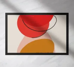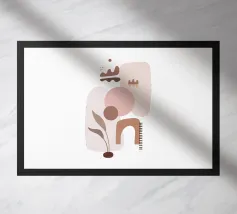 Forme geometriche astratte nei toni del rosso e del marrone si sovrappongono e interagiscono tra loro, creando una composizione dinamica. Le curve morbide e le linee rette si fondono armoniosamente su uno sfondo neutro.