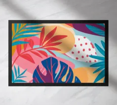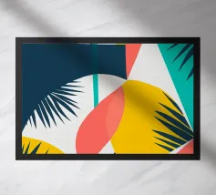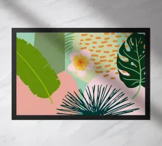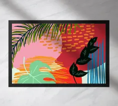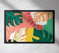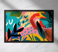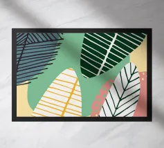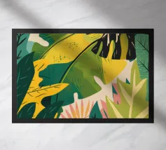 Una giocosa composizione astratta, ricca di audaci forme ispirate alla giungla e di pennellate vivaci. Questo disegno a mano combina verde acqua, blush, senape e menta in un layout gioioso e contemporaneo, perfetto per ravvivare gli interni moderni con un tocco tropicale.