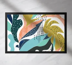 Una giocosa composizione astratta, ricca di audaci forme ispirate alla giungla e di pennellate vivaci. Questo disegno a mano combina verde acqua, blush, senape e menta in un layout gioioso e contemporaneo, perfetto per ravvivare gli interni moderni con un tocco tropicale.