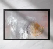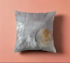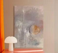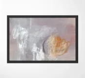 Quadro astratto dai toni morbidi e sfumati. Il colore dominante è un rosa polveroso che si fonde con grigi chiari e tocchi di bianco. Alcune pennellate di arancione caldo emergono sulla destra, creando un punto focale di luce e calore. Le striature di bianco e le texture velate suggeriscono movimento e leggerezza, come se il vapore o la nebbia si dissolvessero nell'aria. Una composizione che trasmette una sensazione eterea e contemplativa, in equilibrio tra calma e dinamismo.