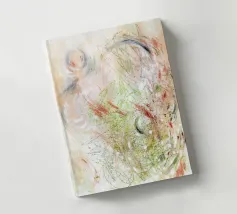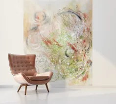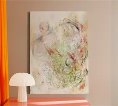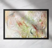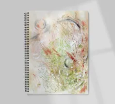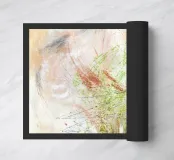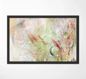 Quest'opera presenta un disegno astratto e dinamico, caratterizzato da una composizione fluida e organica. Le tonalità predominanti del verde chiaro, del rosso terra e del grigio perla si intrecciano su un morbido sfondo beige, creando un senso di movimento circolare e vitale. Pennellate leggere e texture spruzzate conferiscono all'opera un ritmo vibrante. Le linee curve e le sottili sfumature suggeriscono un flusso naturale. Il verde, in particolare, introduce un senso di rinascita e freschezza, mentre i rossi e i grigi bilanciano la composizione con toni più caldi e terrosi. Un gioco di segni dall'impronta gestuale libera e spontanea.