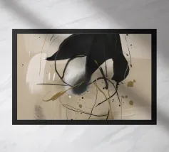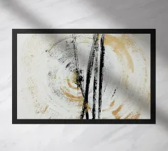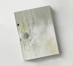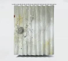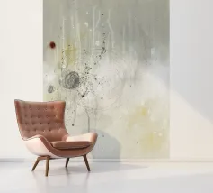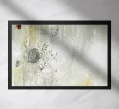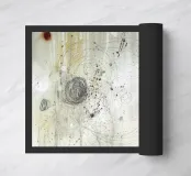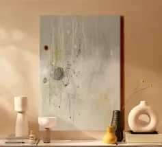 Uno stile astratto e strutturato caratterizzato da una tavolozza molto chiara. Lo sfondo è caratterizzato da gocce, schizzi e macchie verticali. Al centro emergono tracce circolari concentriche, create con sottili segni grafici. Intorno ad esse ci sono piccoli punti e schizzi di nero e grigio. Una profonda macchia rossastra appare in alto a sinistra, in contrasto con la tavolozza tenue della composizione, introducendo un punto focale visivo. L'intera immagine trasmette un'atmosfera eterea, quasi scientifica o cosmica, rappresentando fenomeni naturali microscopici o astronomici reinterpretati in chiave pittorica.