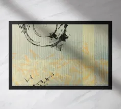 Uno stile astratto e strutturato caratterizzato da una tavolozza molto chiara. Lo sfondo è caratterizzato da gocce, schizzi e macchie verticali. Al centro emergono tracce circolari concentriche, create con sottili segni grafici. Intorno ad esse ci sono piccoli punti e schizzi di nero e grigio. Una profonda macchia rossastra appare in alto a sinistra, in contrasto con la tavolozza tenue della composizione, introducendo un punto focale visivo. L'intera immagine trasmette un'atmosfera eterea, quasi scientifica o cosmica, rappresentando fenomeni naturali microscopici o astronomici reinterpretati in chiave pittorica.