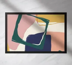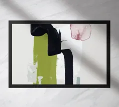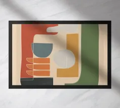 Forme astratte e pennellate decise nei toni della terra si combinano con uno sfondo chiaro. La composizione presenta rettangoli sovrapposti e schizzi a forma libera, creando un look dinamico e moderno.