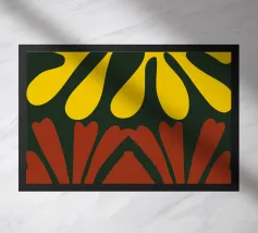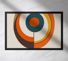 Un audace disegno astratto è caratterizzato da cerchi concentrici rossi e verdi, circondati da punti verdi. Due linee arancioni ondulate aggiungono un movimento dinamico alla composizione.