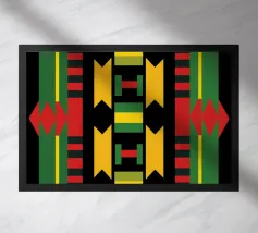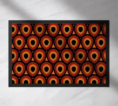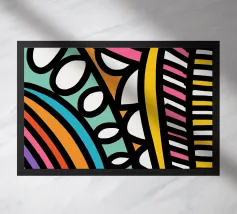 Audaci motivi geometrici con spirali, zigzag, punti e triangoli creano un vivace disegno simmetrico. I colori vivaci come l'arancione, il verde e il giallo contrastano formando un'immagine di grande impatto.