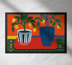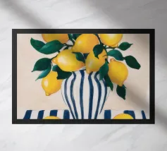 Un albero di limone stilizzato con abbondanti frutti gialli cresce da un vaso a righe bianche e blu, su uno sfondo scuro e lunatico che fa risaltare i colori vivaci della pianta.